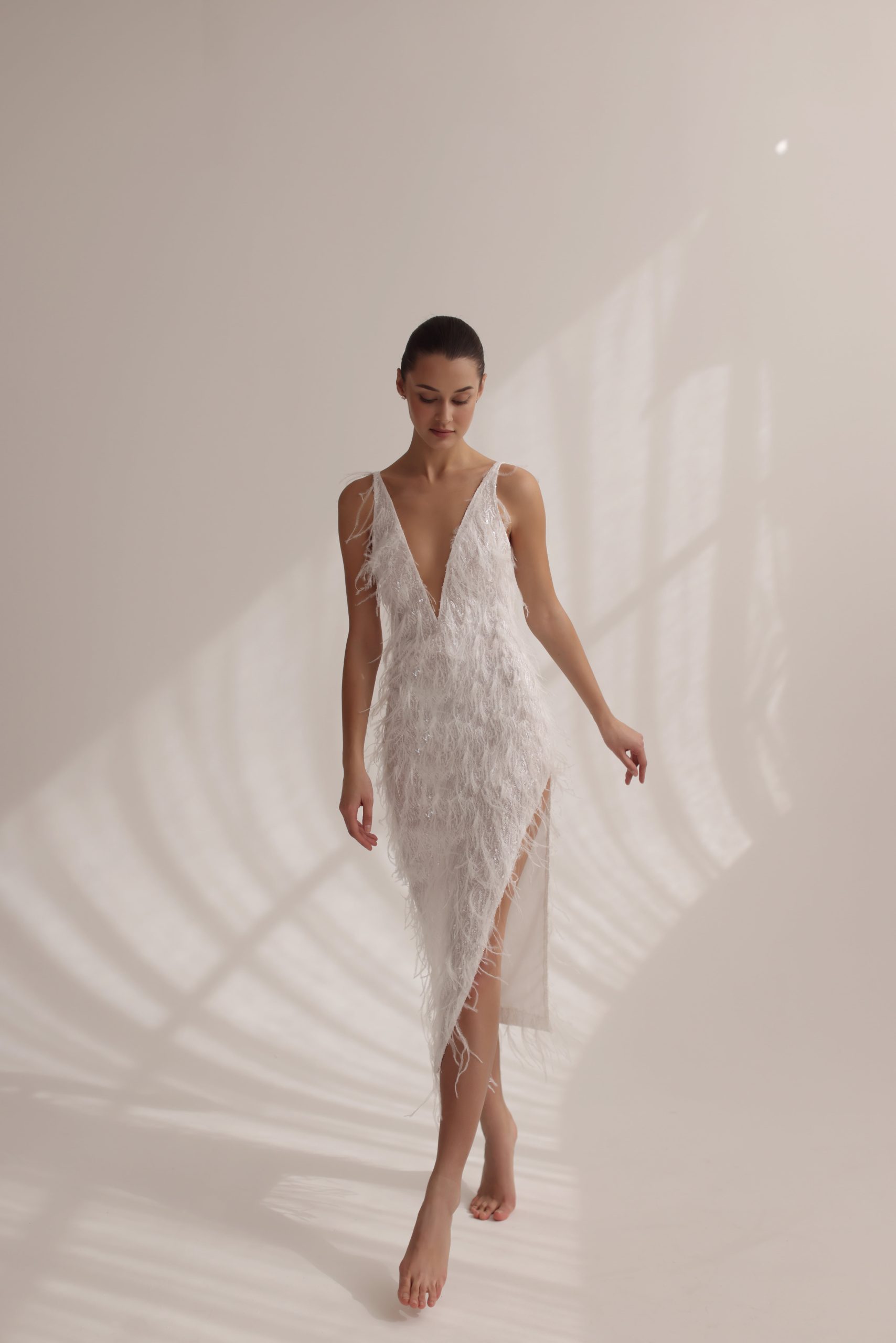 Open v neckline feathers and sequins midi dress. Ivory. Side Slit. Open low back Ivory glitter and tulle lining . Hidden zipper