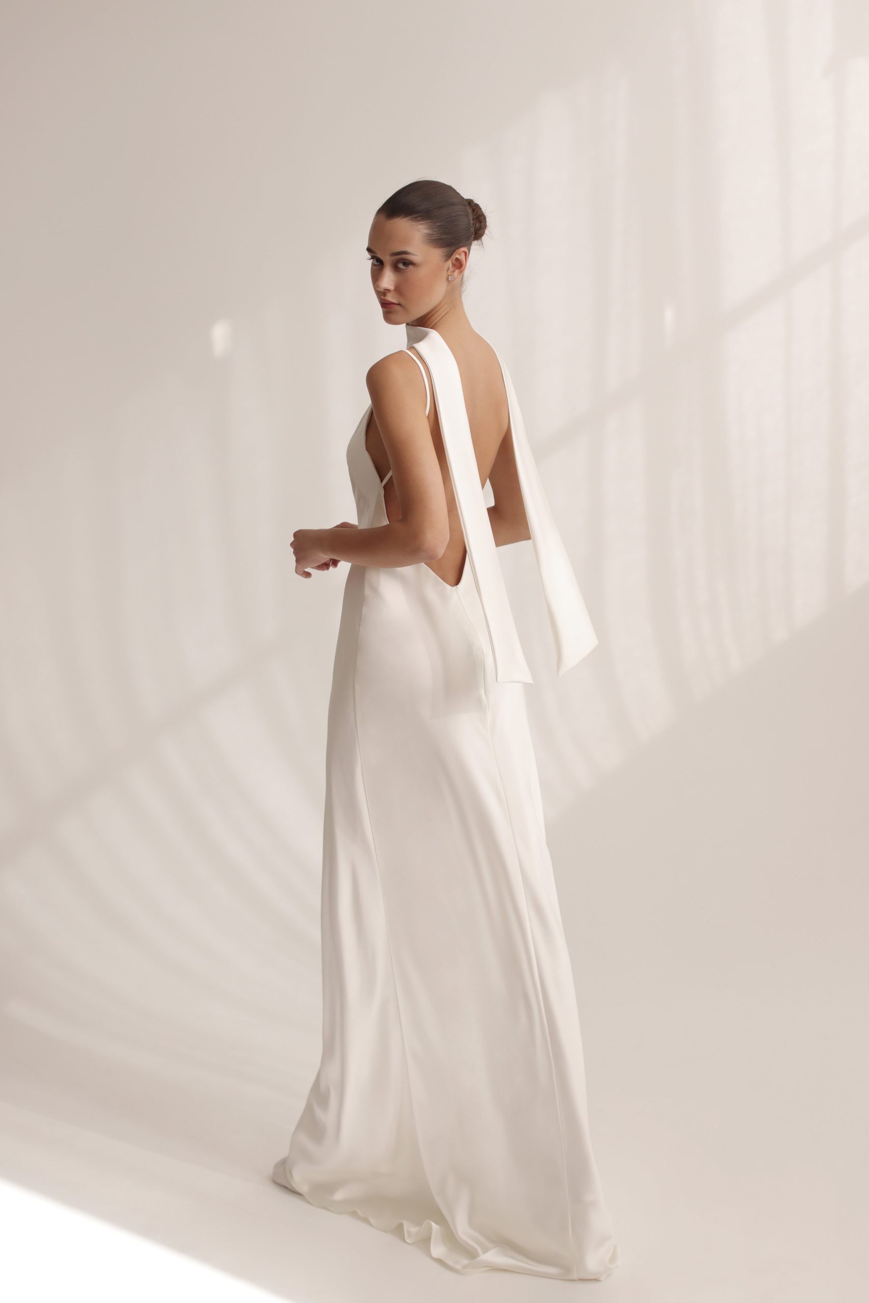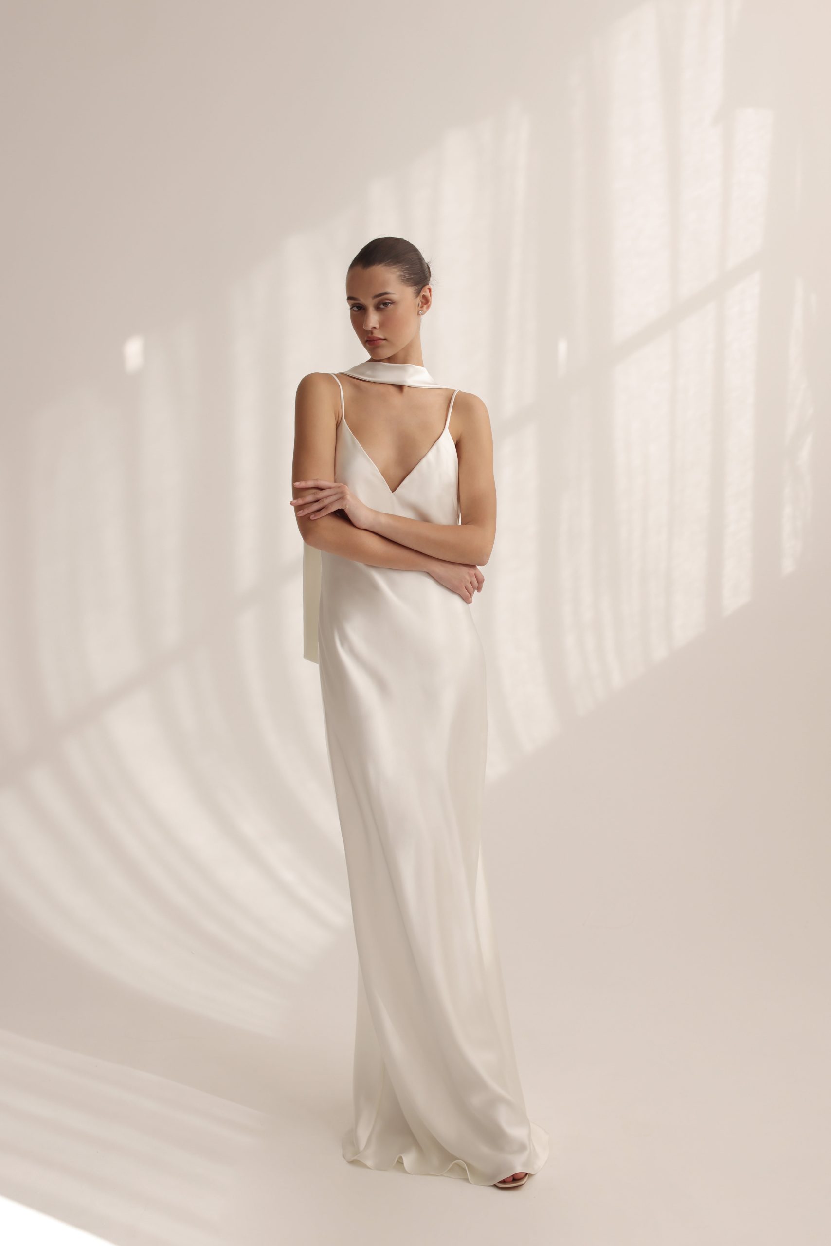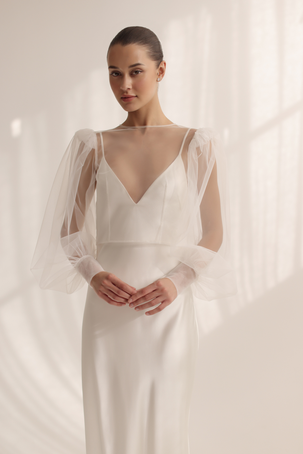 V neckline with Spaghetti straps satin gown. Ivory. Open v back with hidden zipper. Ivory lining Ivory Satin ribbon on neck. Detachable reverse tulle bolero.