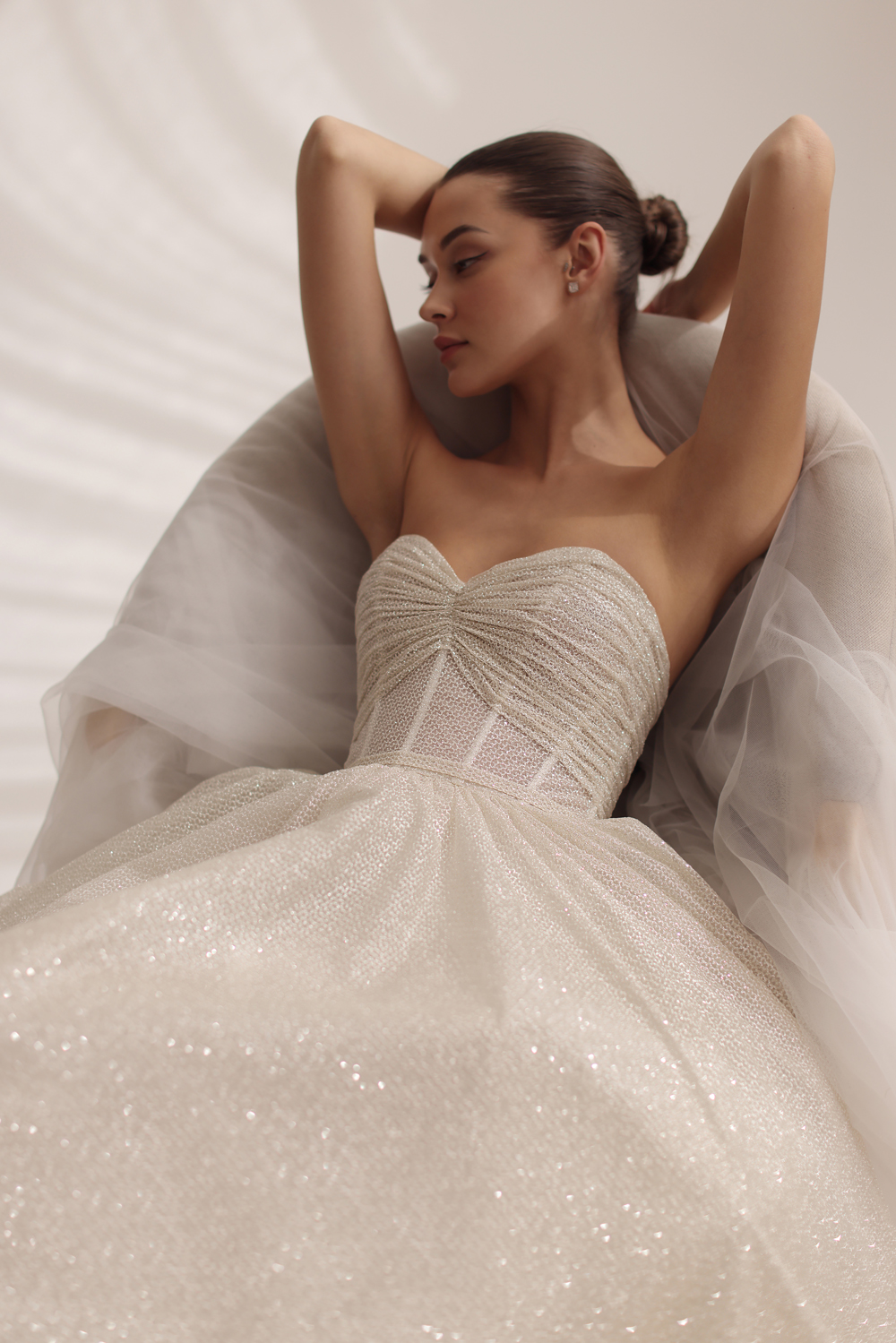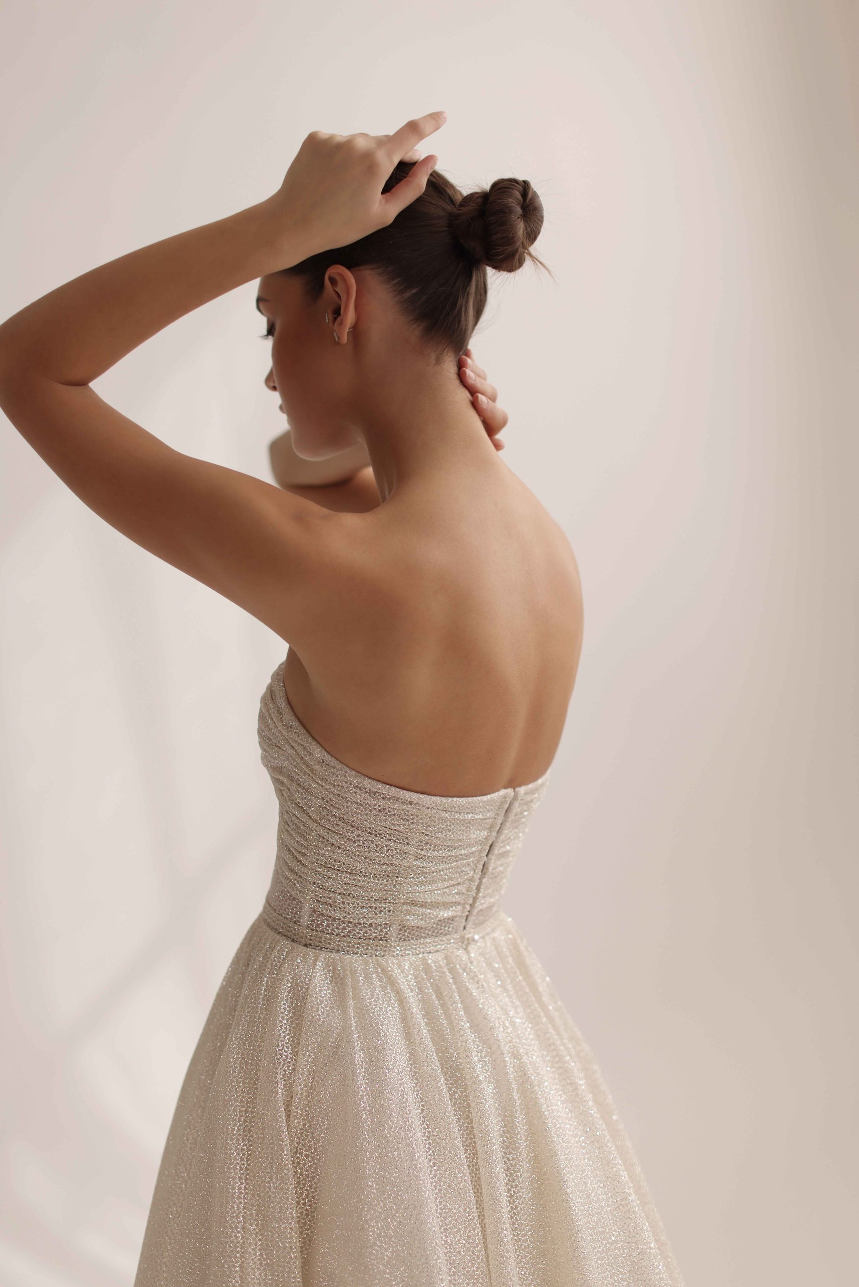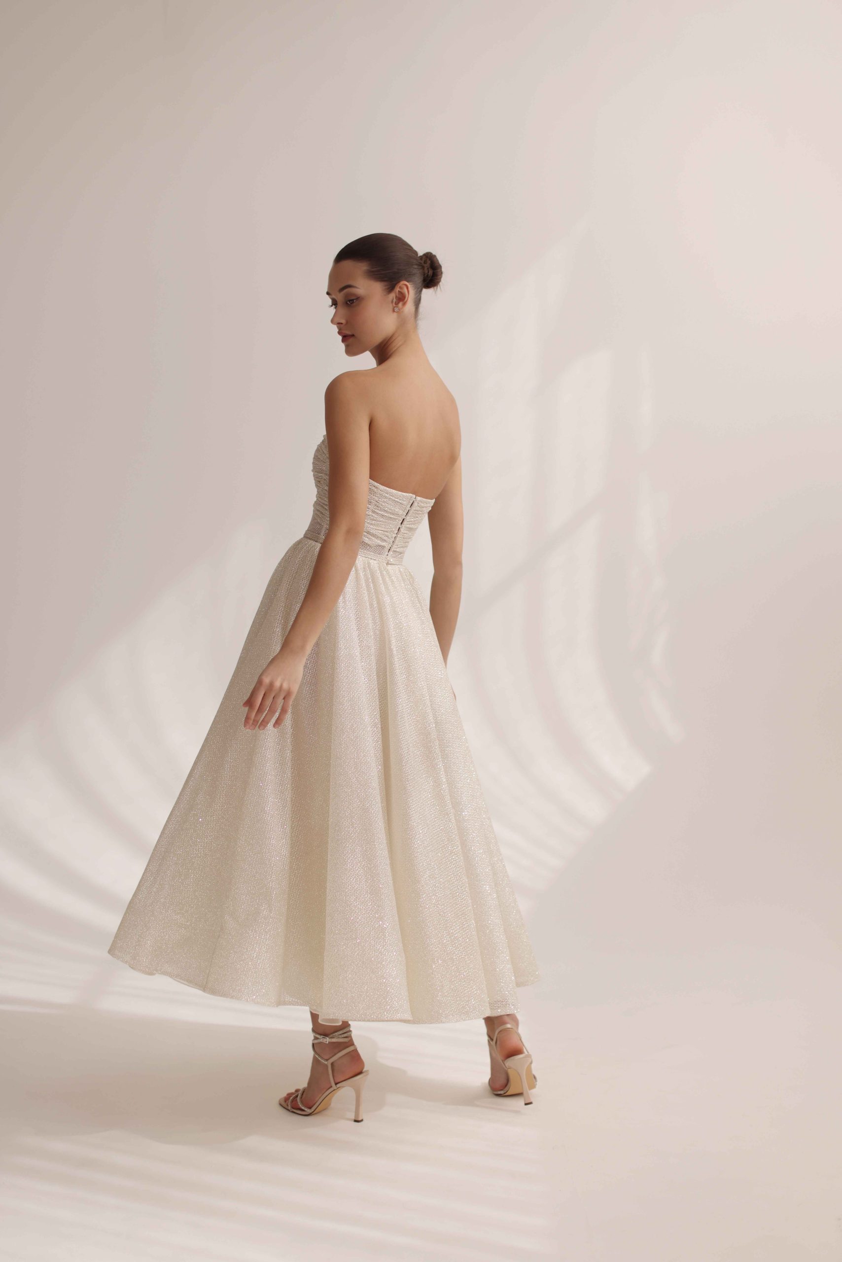 Sweetheart corset glitter midi dress. Ivory and silver. Mid open back with hooks closure. Ivory tulle lining. Full flare glitter skirt with Ivory lining. Hidden zipper.