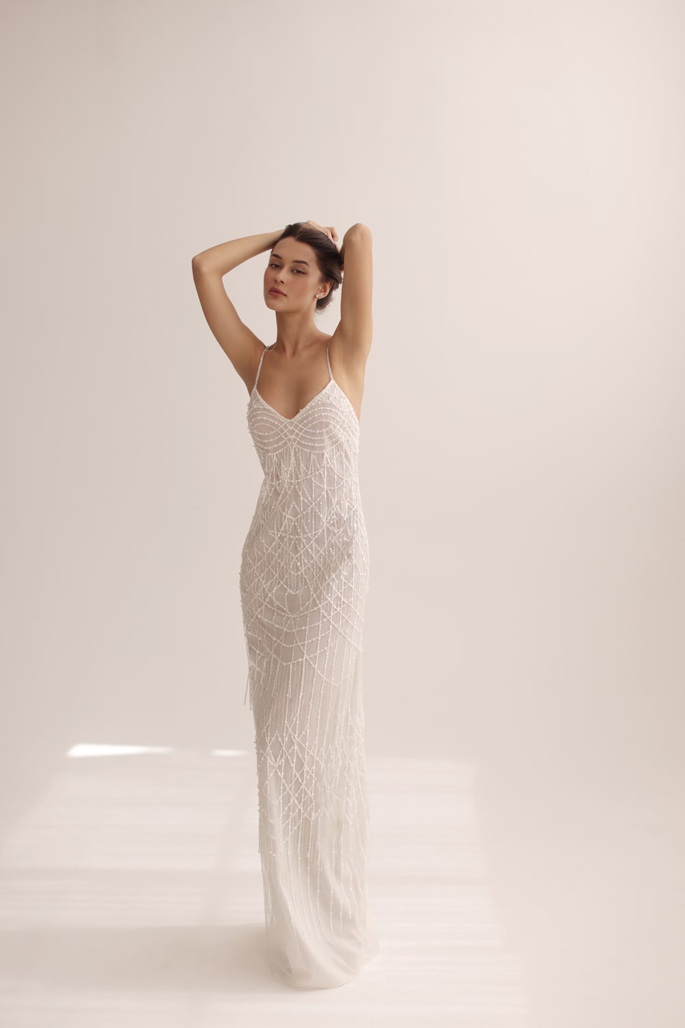 V neckline with Swarovski Spaghetti straps beaded and fringe gown. Ivory. Open V back and Slit. Ivory chiffon lining ,hidden zipper.